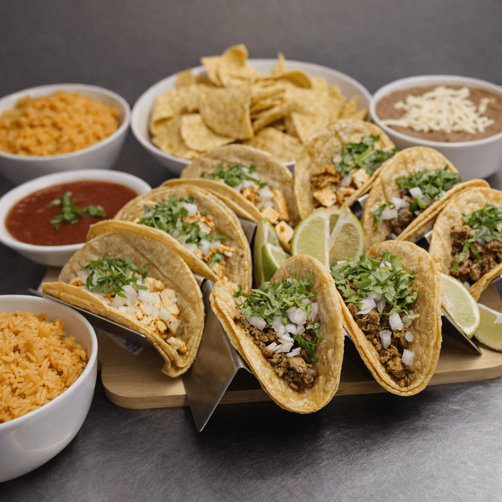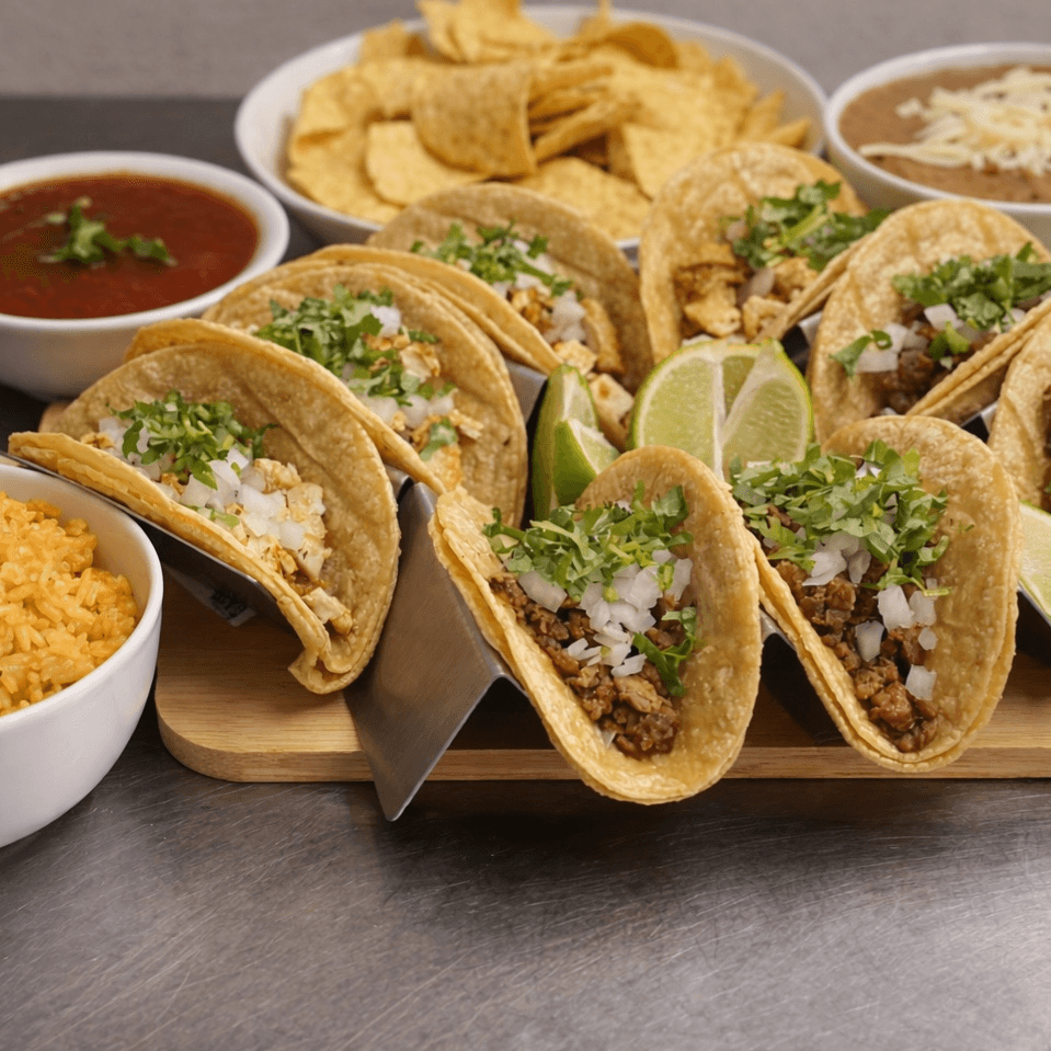 Feeds 4–5. 12 full-size tacos. Choose a style and up to three meats. Includes large rice, large beans, and chips & salsa.