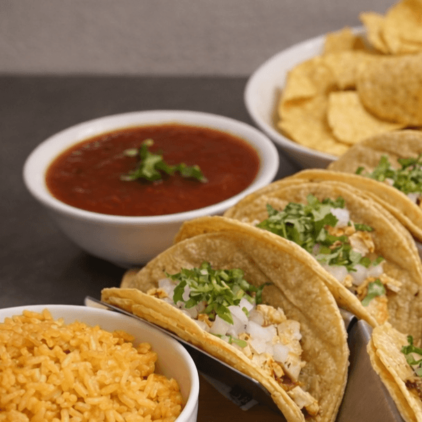 Three tacos served with rice, beans, and chips & salsa