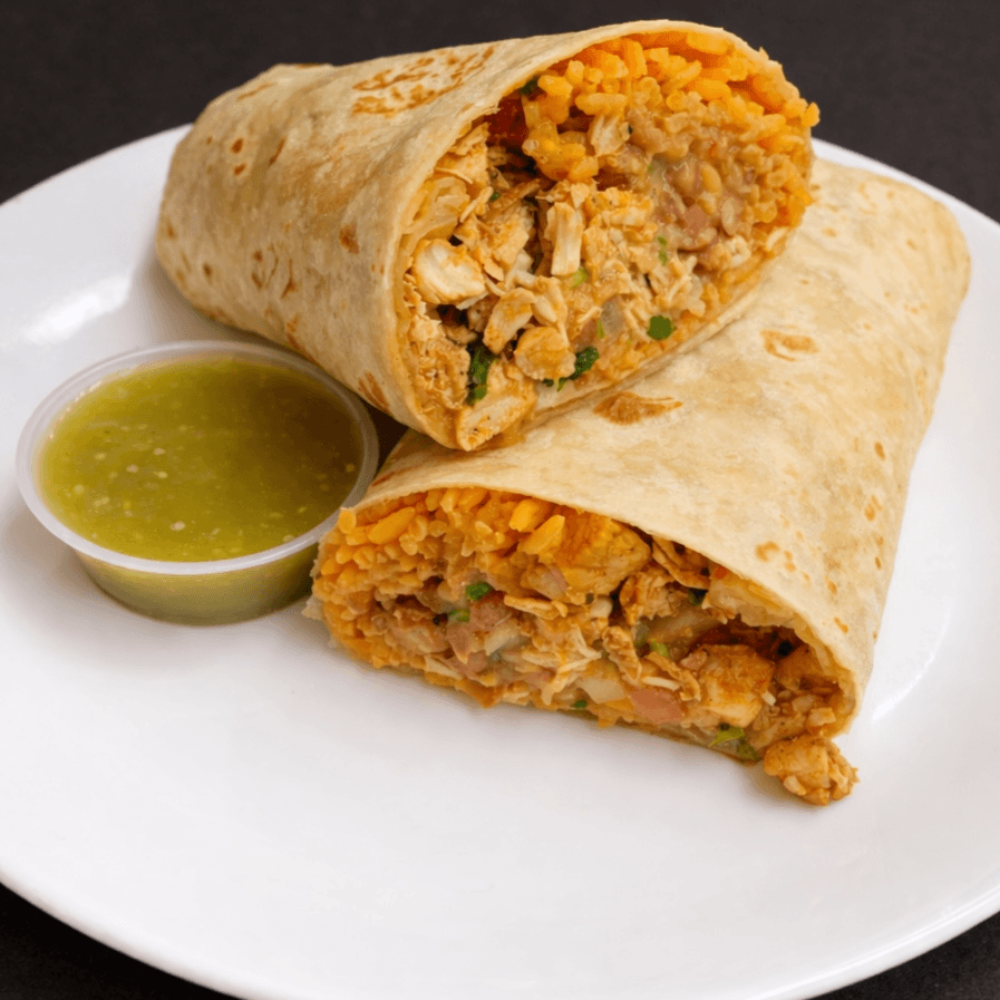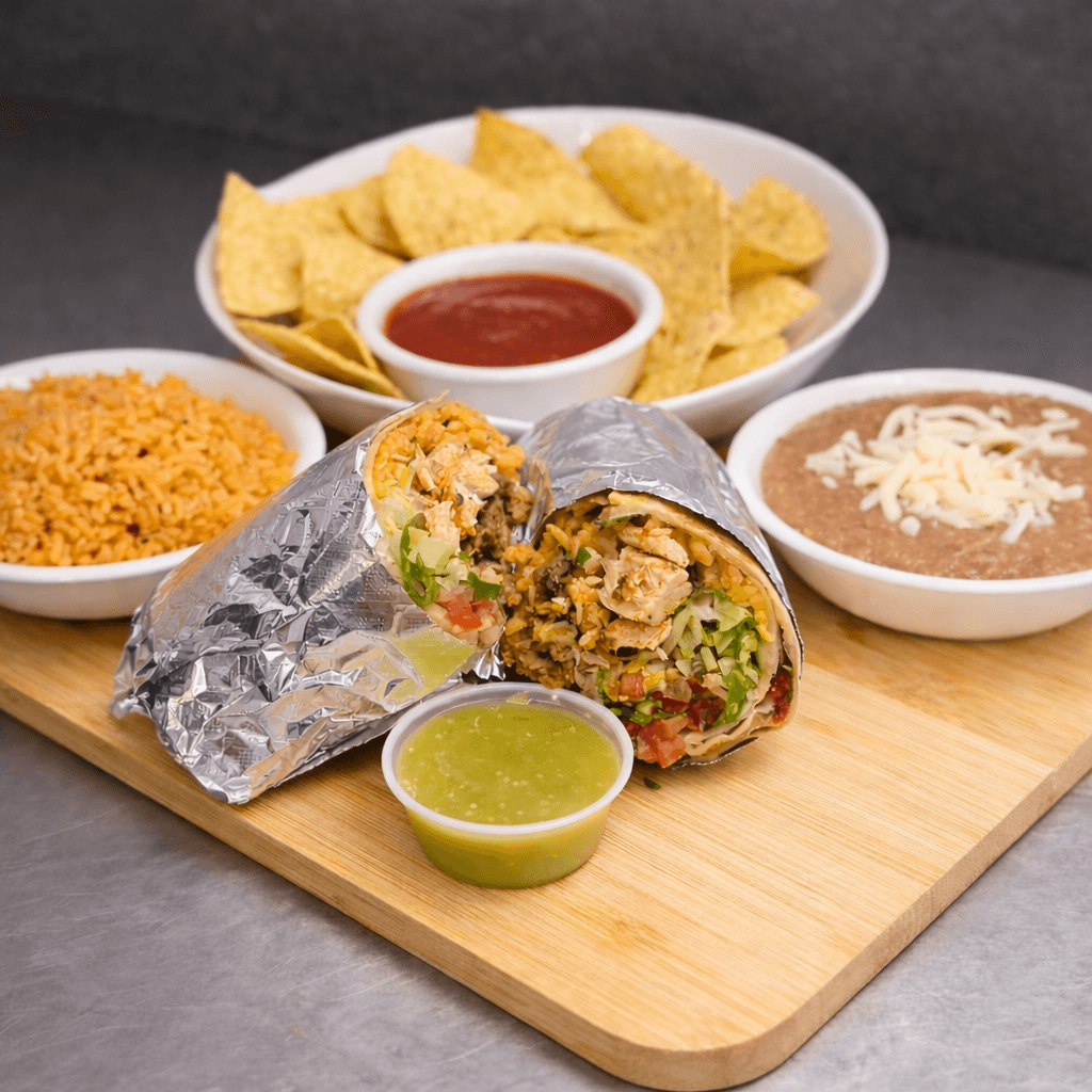 Any burrito served with rice, beans, and chips & salsa
