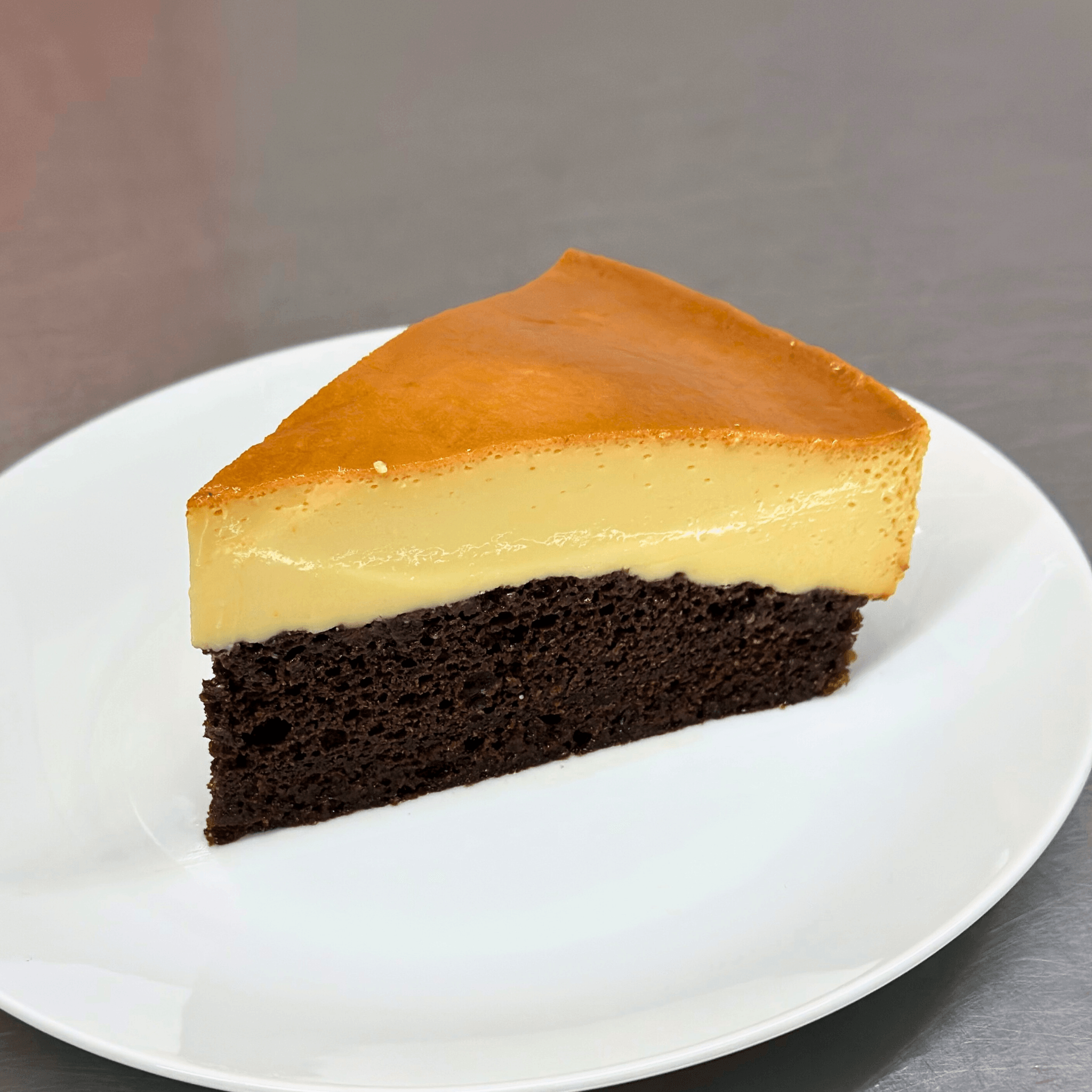 Rich chocolate cake base with a creamy caramel custard layer on top.
